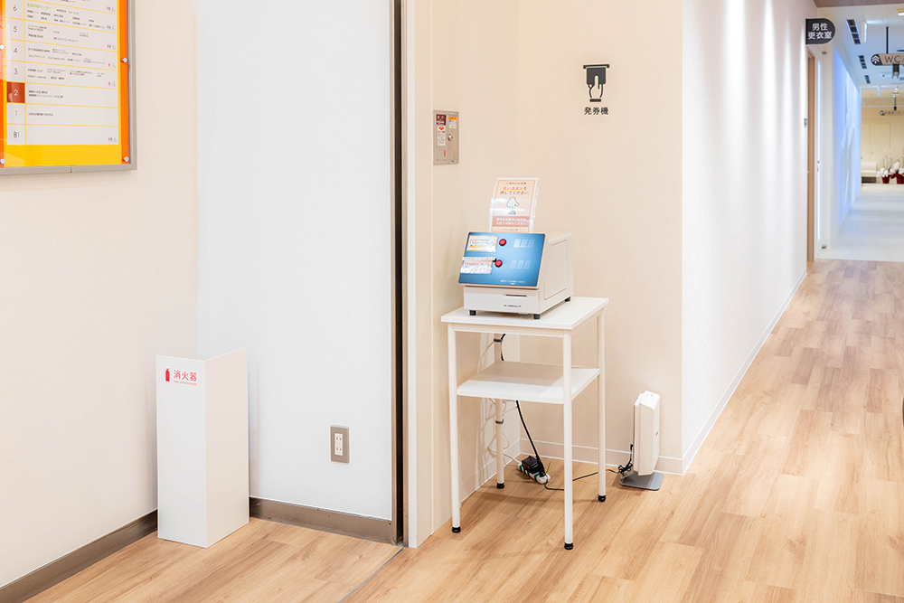 受付左手にあります発券機にて番号札をお取りいただき、番号が呼ばれるまで席にかけてお待ちください。