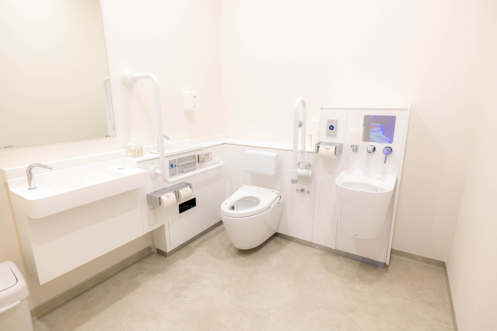 車いすをご利用の方や障がいのある方をはじめ、どなたでも安心してお使いいただけるよう、ユニバーサルデザインを取り入れた多目的トイレを設置しております。
