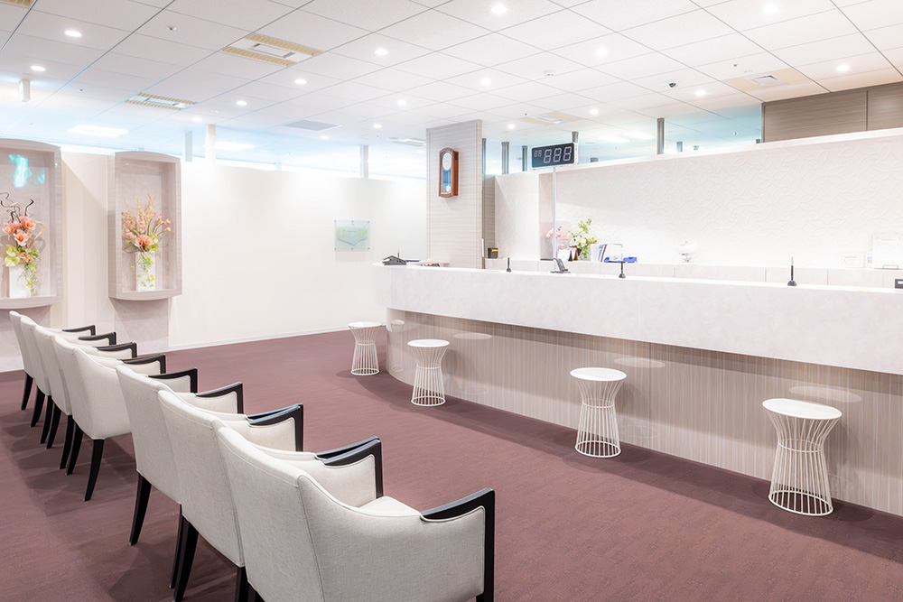 清潔感あふれるラグジュアリーな空間でお待ちしています。受付にて番号札をお取りいただき、順番まで椅子にかけてお待ちください。