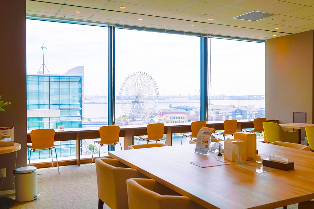 人間ドック、健康診断を終わられた方はこちらの喫茶スペースで、素敵な横浜みなとみらいの風景をみながら、ご休憩いただけます。