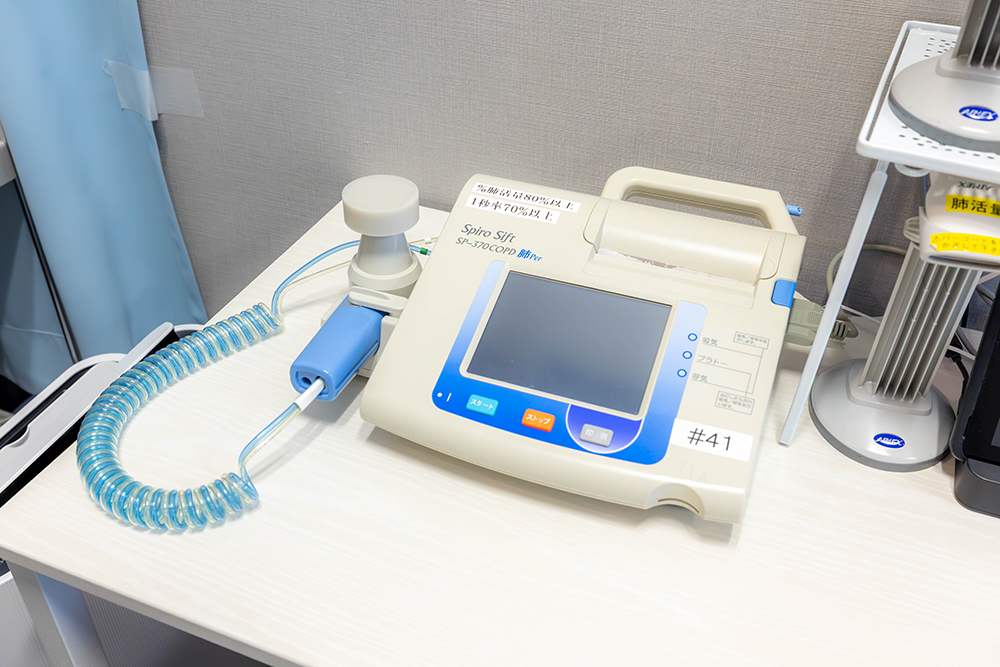 肺機能検査とは、肺がどのくらいの空気を吸い込み・吐き出せるか、また呼吸の勢いやスピードを測定する検査です。検査には「スパイロメーター」という機器を用い、マウスピースをくわえた状態で技師の指示に合わせて呼吸を行っていただきます。鼻は手でつまみ、口呼吸のみで計測します。